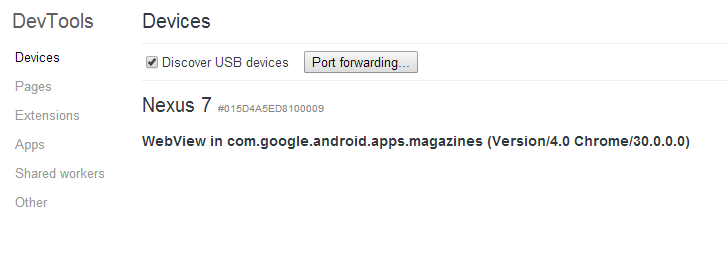 데스크톱 크롬의 Tools ->Inspect Devices를 하면 디버깅이 실행되어야 하는데